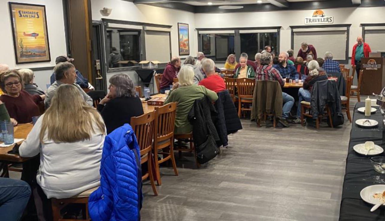 We celebrated at Travelers Pub this year with a banquet table of Italian cuisine. Very good food! The club provided 12 wrapped gifts for the door prize drawing. The cost of a door prize ticket was $1.