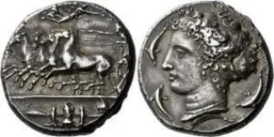 If you look at the obverse of the coin (the left image), you can see a quadrigas (chariot) with all four horses. What is special about this coin is that you can see almost all the legs of the horses. This was not common for this specific coin variety. Another detail that is not common to see is all the dolphins on the reverse (right image) of the coin. All three of them are intact with very little wear.