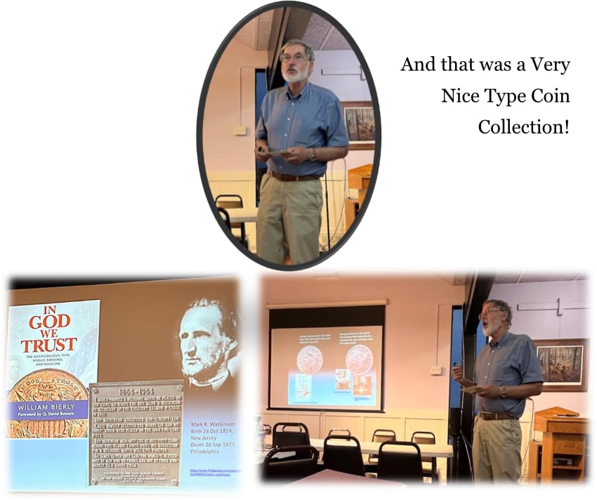 Then in September, ErnieNagy gave another one of his great presentations, this time on collecting coins by type. Ernie gave us a very informative presentation, ranging from half cents to silver dollars with an incredible amount of history about each. Most interesting to me was that Ernie used his personal Type Coin Collection in his slides, and for most of us, that was the “icing on the cake”. We got to see firsthand what he was discussing. Always an enjoyable and informative presentation by Ernie and we are looking forward to the next one!!!