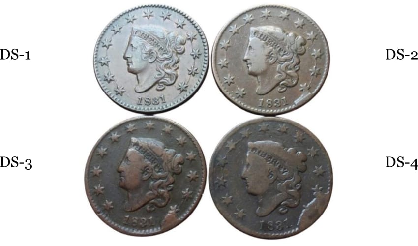 Die States provide valuable insights into a coin’s history and production process. Whether you’re a seasoned collector or just starting out, understanding die states enhances your appreciation of numismatics! Below you see four distinct die progressions involving stars 12 and 13 on a large cent. The final die state is referred to as the “Harpooned Whale” and is highly sought after by collectors.