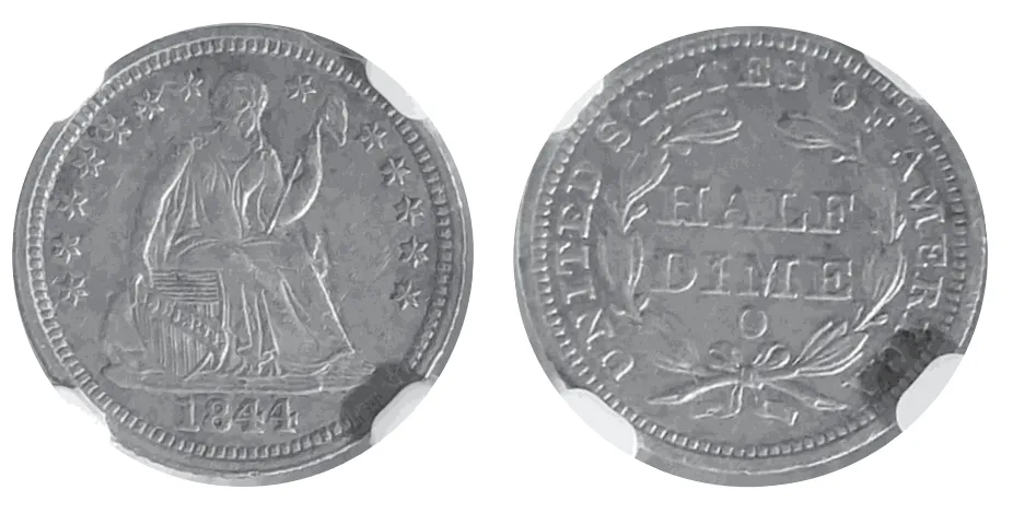 About 2 months later Scott called me and said the coins I had sent in were there. When I got there, he opened the box, and somehow, it felt a little like Christmas. Most of the coins came back at grades I expected. The 1844-O half-dime came back graded AU-53; and I broke into my happy dance. Scott offered to buy it, so I asked him to make me an offer. He broke out his Graysheet. He did not realize the coin at this grade was so expensive, and we mutually